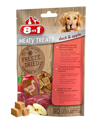 La ricetta del petto d'anatra e mele offre tutti i benefici di una carne di alta qualità abbinata a un delizioso frutto. I liofilizzati 8in1 sono gustosi bocconcini liofilizzati a base di carne per il vostro cane.