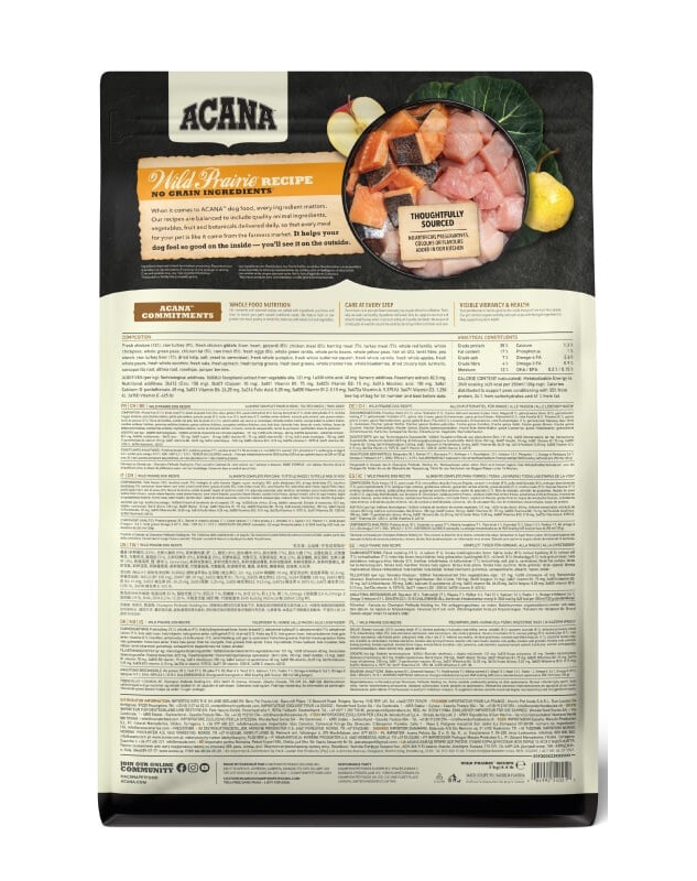 Pollo fresco (13%), tacchino crudo (9%), interiora di pollo fresche (fegato, cuori, ventrigli) (8%), pollo disidratato (8%), aringhe disidratate (7%), tacchino disidratato (7%), lenticchie rosse intere, ceci interi, piselli interi, grasso di pollo (5%), trota cruda (5%), uova fresche (5%), lenticchie verdi intere, fagioli pinto interi, piselli gialli interi, olio di pesce (2%), fibra di lenticchie, amido di piselli, fegato di tacchino crudo (1%), alghe essiccate, sale, lievito (S. cerevisiae), zucca intera fresca, zucca butternut intera fresca, carote intere fresche, mele intere fresche, pere intere fresche, zucchine intere fresche, cavolo riccio fresco, spinaci freschi, cime di rapa fresche, barbabietola fresca, mirtilli rossi interi, mirtilli interi, radice di cicoria essiccata, curcuma, radice di salsapariglia, radice di altea, frutto di rosa canina, bacche di ginepro.