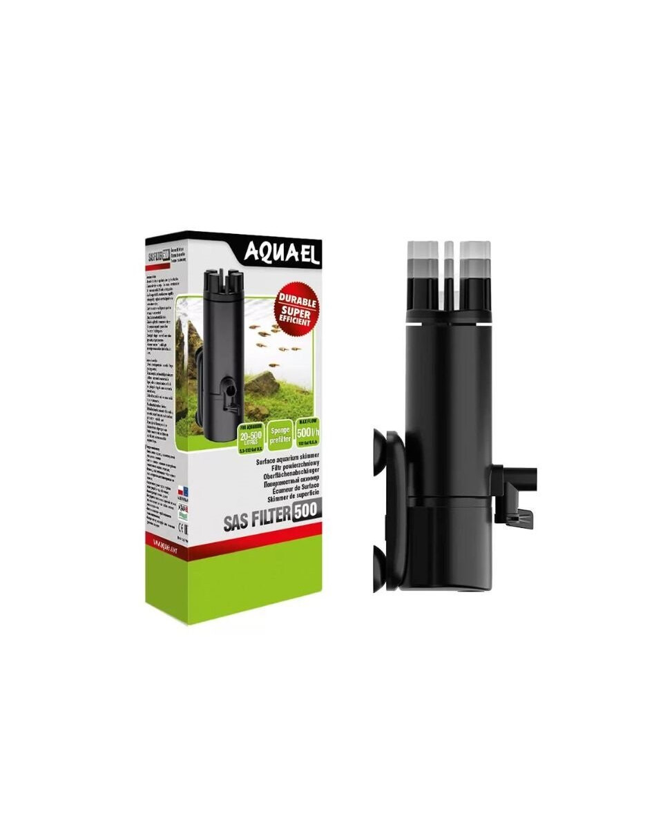 SAS FILTER 500 è un filtro di superficie progettato per rimuovere uno strato di impurità dalla superficie dell'acqua, tra cui polvere, film proteici o piccoli detriti vegetali. Aiuta a mantenere l'aspetto estetico dell'acquario e supporta i processi di filtrazione e aerazione dell'acqua. Grazie alla sua capacità regolabile, è ideale per acquari con superfici d'acqua sia grandi che piccole.