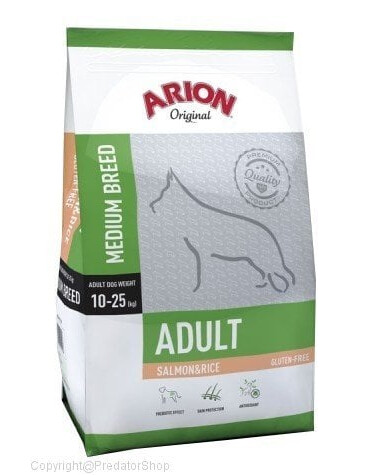 Arion Original Medium Breed è un alimento secco per cani adulti di razza media (peso del cane adulto fino a 11-25 kg). Gli ingredienti principali di questo alimento sono il salmone e il riso. L'alimento non contiene glutine, prodotti a base di mais o altri cereali.