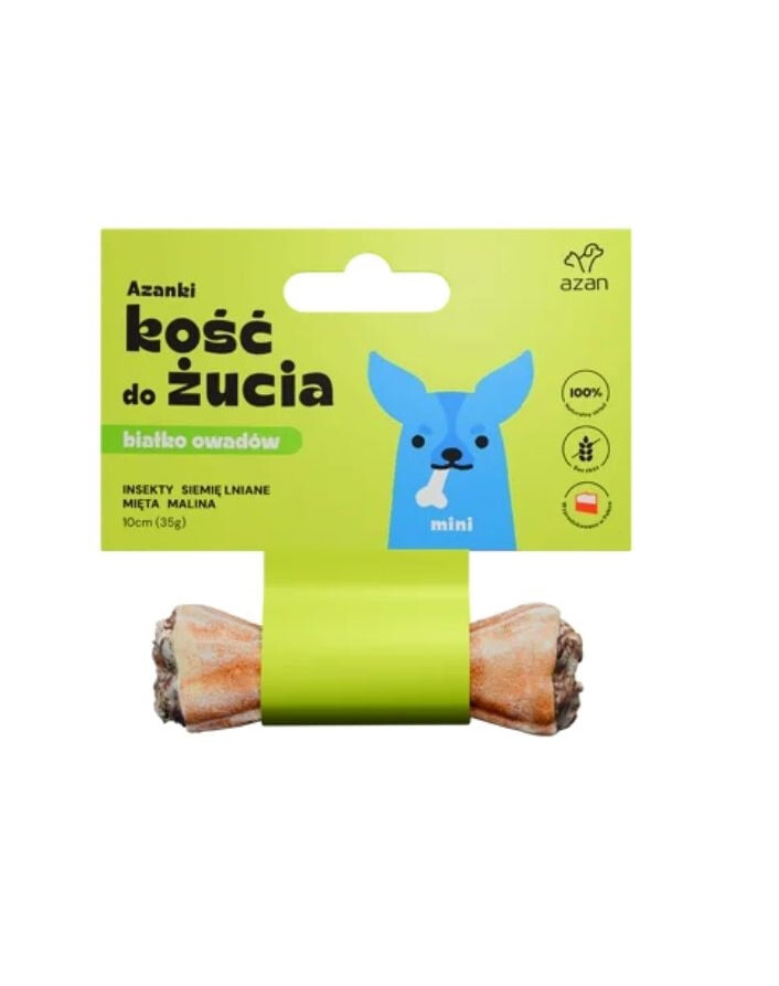 Gli ossi da masticare Azanki Mini contengono insetti, semi di lino, menta e lamponi e sono un'ottima leccornia per cani adulti di piccola taglia e razze piccole, che soddisfa il loro naturale bisogno di masticare e mordere. Gli ossi non contengono parti taglienti o frangibili, il che li rende un'alternativa più sicura ai vari tipi di masticatori.