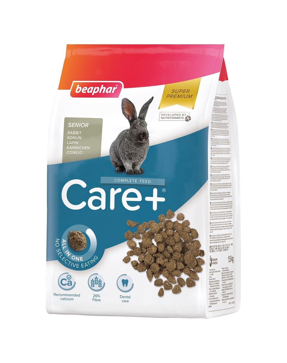 Care+ Senior Rabbit to wyjątkowo smaczna, karma klasy Super Premium. Jej receptura została opracowana przy współudziale lekarzy weterynarii i dietetyków. Care+ jest wytwarzana w procesie ekstruzji i dlatego każda granulka ma identyczny skład (wszystko w jednym). Dzięki temu zwierzęta nie pozostawiają żadnych resztek, a hodowcy mogą być pewni tego, że wszystkie niezbędne dla zdrowia składniki zostały spożyte – wyeliminowano w ten sposób całkowicie zjawisko selektywnego wyjadania smakowitszych składników karmy. Odpowiednia twardość granulek wpływa na prawidłowe ścieranie się zębów. Osiągana temperatura w trakcie produkcji poprawia przyswajalność białka. Granulki wyróżniają się niską zawartością wapnia, zrównoważonym poziomem ważnych wielonienasyconych kwasów tłuszczowych Omega 6 & Omega 3 (pochodzących z pszenicy, soi i siemienia lnianego), odpowiednią zawartością włókna pokarmowego i dodatkiem aromatycznego ekstraktu z tymotki łąkowej. Istotną funkcję przeciwutleniaczy spełniają witamina C, witamina E i ekstrakt z zielonej herbaty oraz żeń-szeń wspomagając w ten sposób naturalne siły obronne organizmu królika. Care+ Senior Rabbit posiada niską zawartość białka i nie zawiera dodatku cukru, aby zapobiegać otyłości u tych mniej aktywnych królików. Care+ Senior Rabbit jest idealnie zbilansowaną karmą dla starszych królików, która spełnia ich wszystkie naturalne potrzeby żywieniowe.