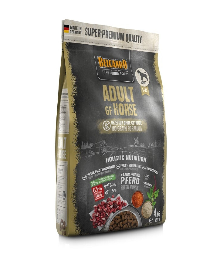 Con la sua carne di cavallo eccezionalmente fresca e gli ingredienti selezionati, BELCANDO® Adult GF Horse offre ai cani una delizia speciale. Grazie alla ricetta priva di cereali e alla gustosa ed esclusiva variante di carne, questo alimento secco è particolarmente adatto ai cani sensibili. Inoltre, preziosi ingredienti forniscono contenuti in grado di aumentare in parte la vitalità e il benessere del cane. Ad esempio, l'amaranto, che è una valida alternativa ai cereali, fornisce importanti nutrienti e vitalità. La combinazione di amaranto e krill, una preziosa fonte di acidi grassi omega-3, dà vita a una ricetta molto equilibrata.
