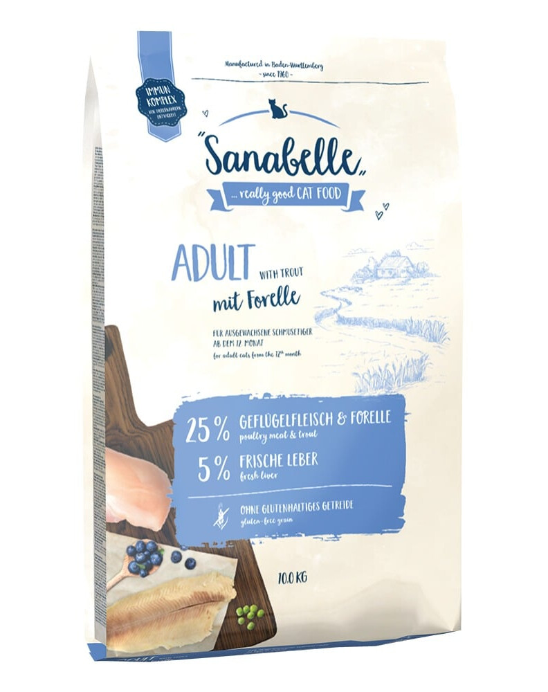 Carne di pollame (fresca, 20%), proteine di pollame (essiccate), riso, farina di riso, trota fresca (5%), fegato fresco (5%), farina di fegato, proteine idrolizzate, grasso animale, polpa di barbabietola (senza zucchero), semi di lino, fibra di pisello, olio di salmone, carbonato di calcio, uova in polvere, piselli (disidratati 0,4%), lievito (disidratato, di cui 0,1% mannano-oligosaccaridi, 0,06% β-glucano), cloruro di potassio, mirtilli rossi (disidratati, 0,1%), mirtilli (disidratati, 0,1%), cozze dalle labbra verdi (essiccate), fiori di calendula (disidratati), cicoria in polvere, yucca (disidratata)