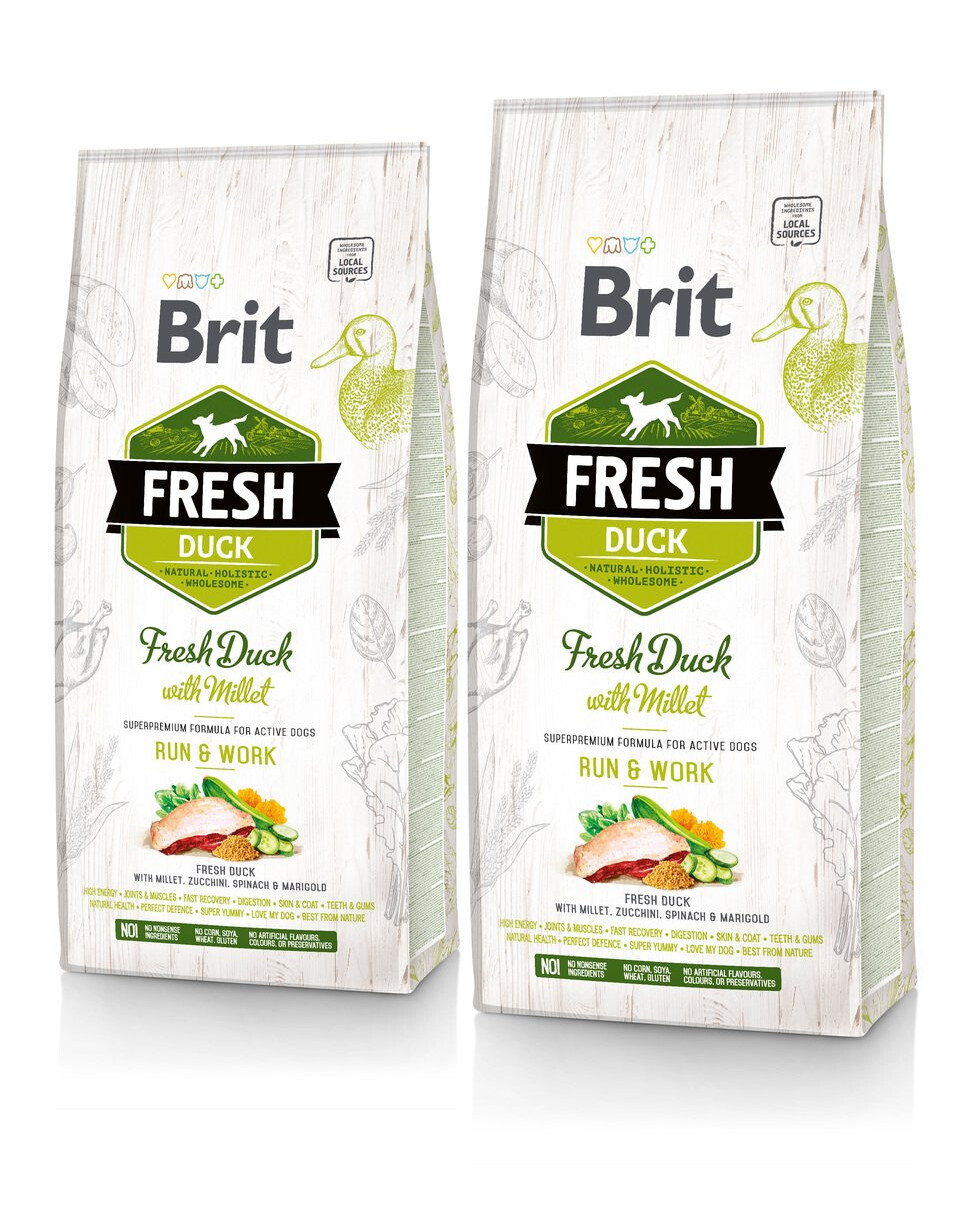 Anatra fresca (40%), anatra essiccata (30%), grasso di pollo (conservato con tocoferoli misti), avena, miglio (4%), grano saraceno, mele, barbabietola intera, olio di salmone, fegato di pollo, lievito di birra, semi di lino, collagene, zucchine (2%), spinaci (0,4%), alghe, ribes nero, prezzemolo, rosmarino, timo, calendula (0,3%), tarassaco, probiotici (Enterococcus faecium 1x10 9 CFU)