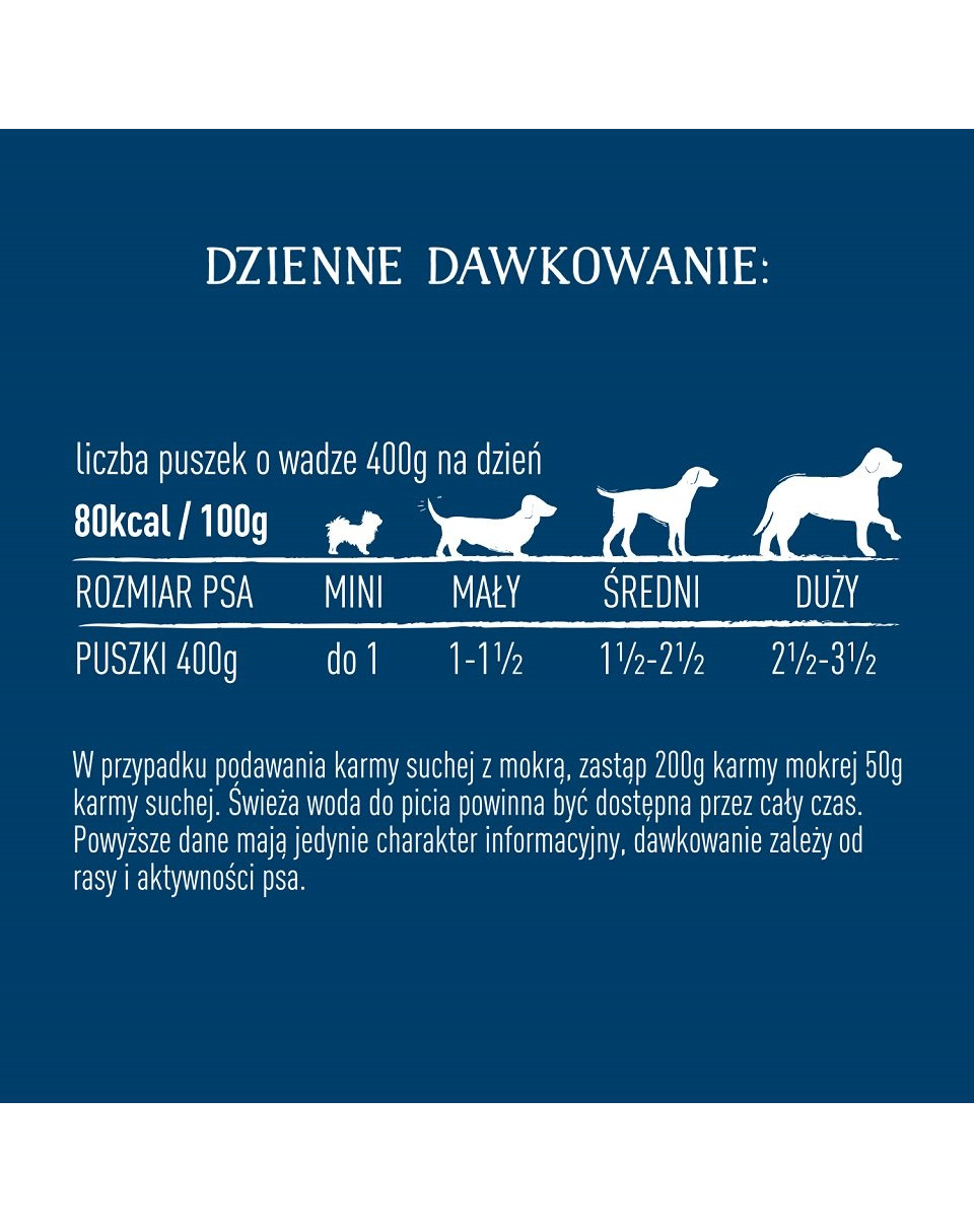 Quando si somministra cibo secco con cibo umido, sostituire 200 g di cibo umido con 50 g di cibo secco. L'acqua potabile fresca deve essere sempre disponibile. I dati riportati a fianco sono puramente indicativi, il dosaggio dipende dalla razza e dall'attività.