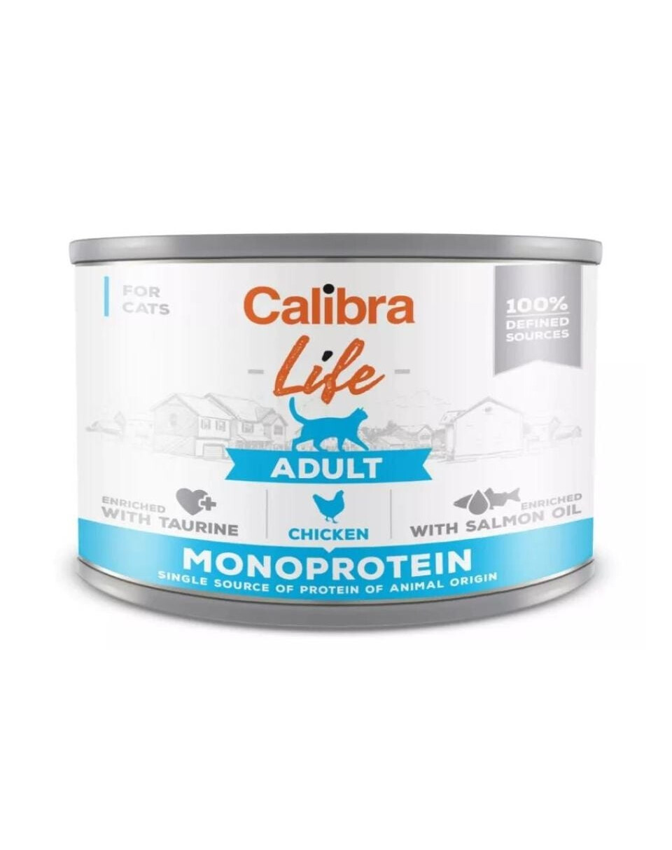 Calibra Cat Life Adult Chicken è un alimento umido completo con pollo per gatti adulti basato su un unico tipo di proteina.