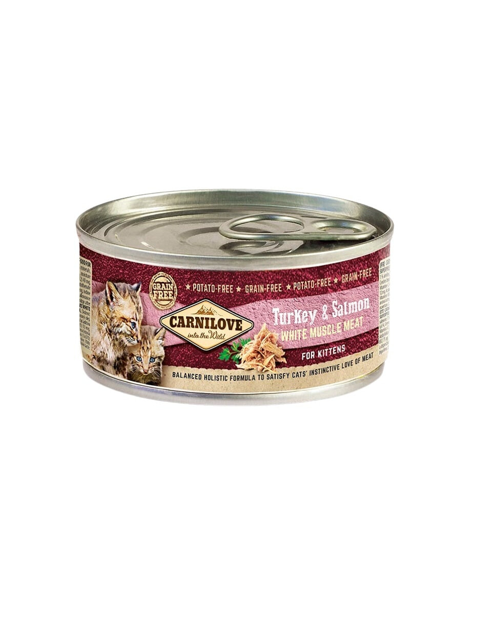 CARNILOVE Turkey and Salmon for Kittens è un cibo umido ad alto contenuto di carne, creato per soddisfare le esigenze dei gattini in crescita. Grazie al tacchino facilmente digeribile e al nutriente salmone, fornisce una solida porzione di proteine e acidi grassi essenziali per un corretto sviluppo. L'aggiunta di vitamine, minerali e mirtilli rossi supporta il sistema immunitario, le ossa sane e il sistema urinario – senza cereali, patate o additivi artificiali.