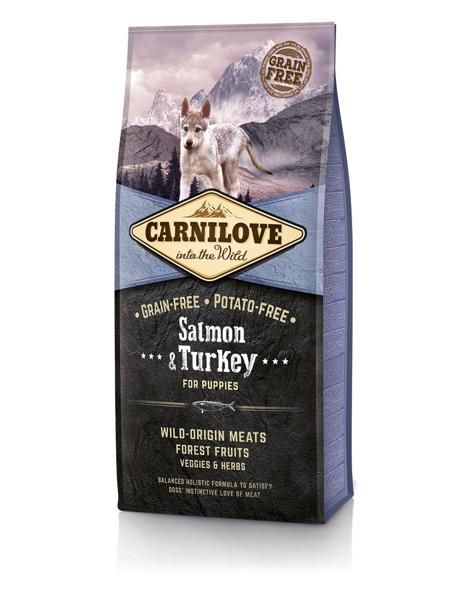 Adatta alle maggiori esigenze nutrizionali dei giovani organismi. Non contiene cereali o patate per non irritare lo stomaco delicato dei cuccioli. Contiene il 45% di farine di carne - da salmone e tacchino. Contengono alti livelli di oligoelementi, come lo zinco, e di vitamine del gruppo B, raccomandate per il corretto funzionamento del cervello e dei muscoli. Il salmone (30%) e l'olio di salmone sono ricche fonti di acidi grassi insaturi, che hanno un effetto positivo sullo sviluppo del sistema nervoso, del sistema immunitario e si prendono cura anche della bellezza della pelle e del pelo del cane. Verdure, frutta ed erbe completano il mix con antiossidanti naturali, vitamine e minerali. Tutto ciò di cui il cane ha bisogno per la crescita e lo sviluppo fino al primo anno di vita.