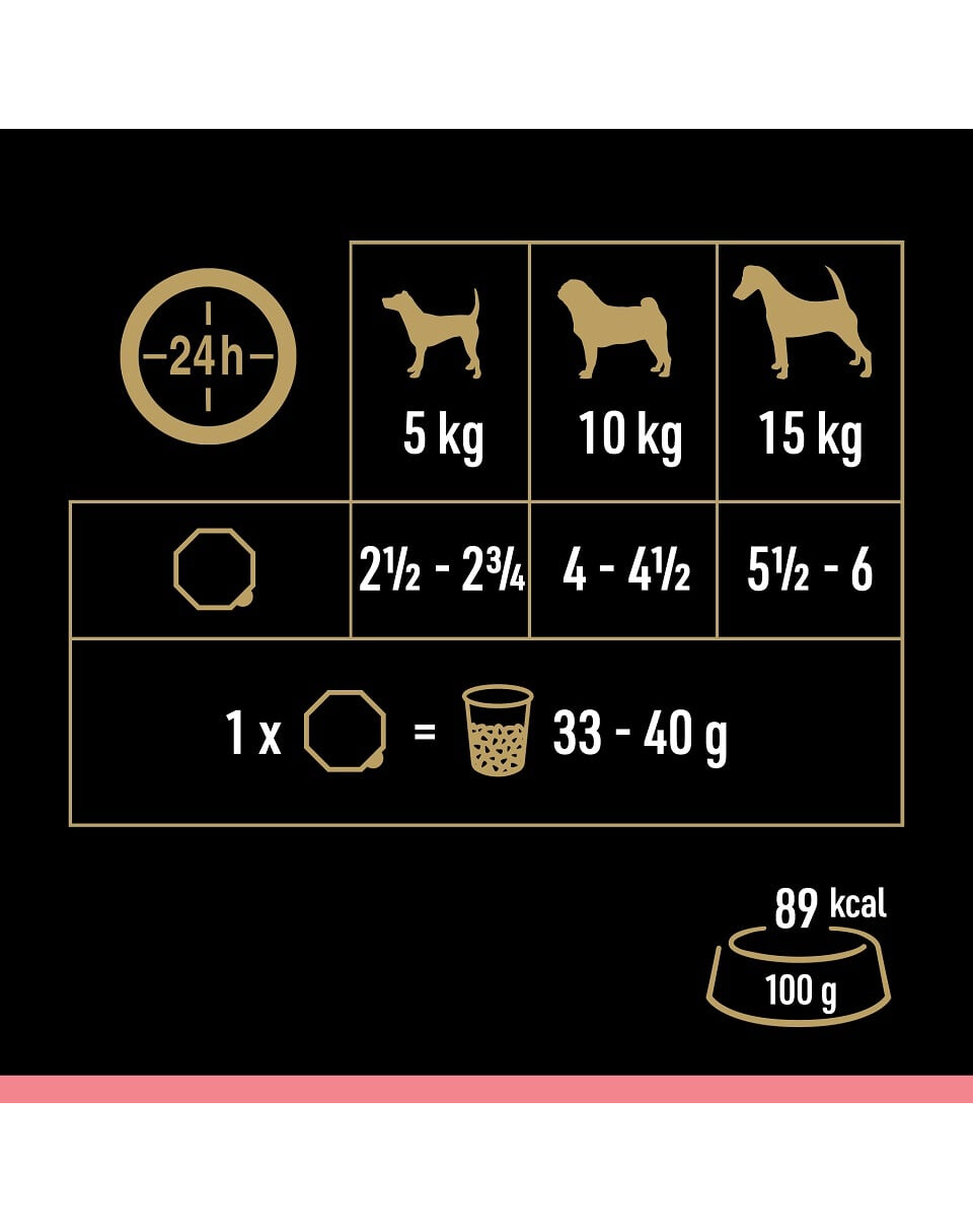 Un cane di 5 kg ha bisogno di 2½ - 2¾ vaschette al giorno, un cane di 10 kg ha bisogno di 4 - 4½ vaschette al giorno, un cane di 15 kg ha bisogno di 5½ - 6 vaschette al giorno. 1 vaschetta può essere sostituita con 33 - 40 g di cibo secco.