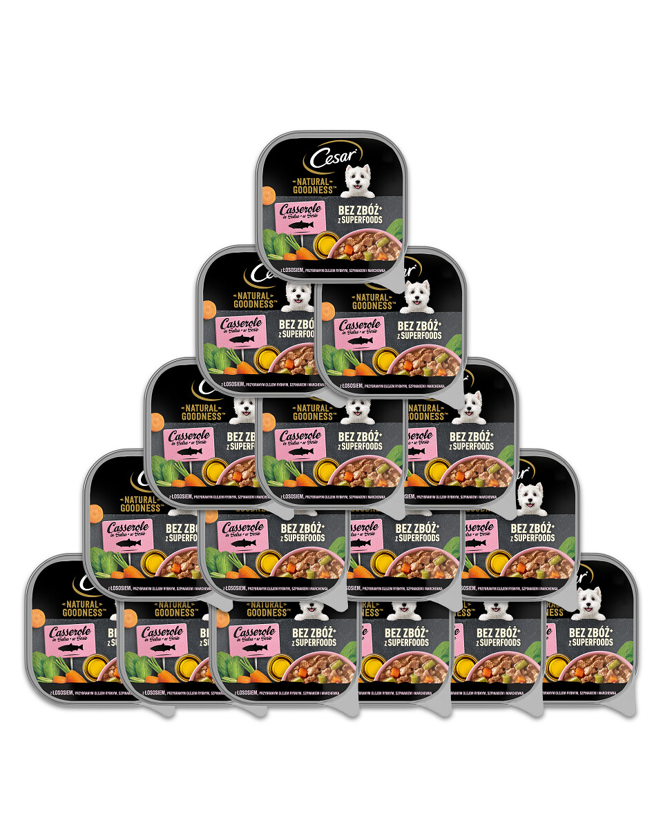 Cesar Natural Goodness con salmone in salsa è stato preparato secondo una ricetta senza cereali accuratamente selezionata che fornisce ai cani tutto ciò di cui hanno bisogno ogni giorno. Questo piatto è ideale per un pasto quotidiano, fresco e delizioso. È possibile servire questo alimento con il cibo secco o come piatto a sé stante. Il gusto con salmone è arricchito con olio di pesce, spinaci e carote: il salmone è una fonte di proteine, l'olio di pesce di acidi grassi Omega-3 e le carote sono una fonte di antiossidanti. Il cibo per cani Cesar Natural Goodness è stato preparato per mantenere il suo valore nutrizionale naturale e il suo gusto delizioso. Nel suo sviluppo sono stati coinvolti nutrizionisti e veterinari del WALTHAM Institute of Animal Science.
