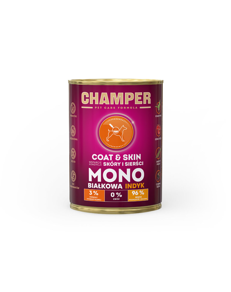 Ricetta ad alto contenuto di carne basata su tacchino facilmente digeribile – fonte di proteine complete. La composizione monob proteinica rende il cibo ideale anche per cani con allergie alimentari e un sistema digestivo sensibile.
