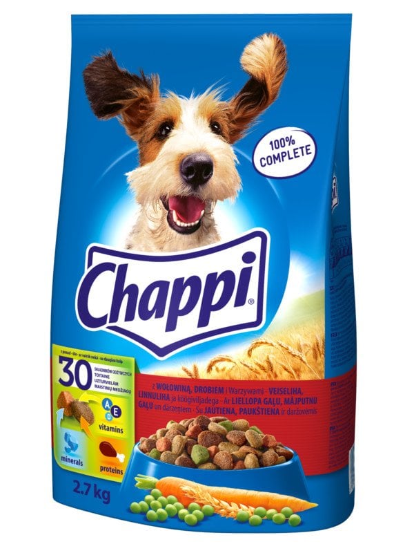 Il cibo secco per cani CHAPPI con Manzo, Pollame e Verdure è un alimento completo ed equilibrato che manterrà il tuo cane ben nutrito, felice e pieno di vita. La formula CHAPPI fornisce al tuo animale domestico oltre 30 nutrienti, tra cui: acidi grassi, vitamine: A, E, D3, minerali e proteine. CHAPPI con manzo, pollame e verdure è un alimento nutriente per cani sotto forma di granuli croccanti che soddisferà sicuramente il palato del tuo animale. Questo cibo secco per cani è stato sviluppato da nutrizionisti e veterinari del WALTHAM Institute of Animal Science.