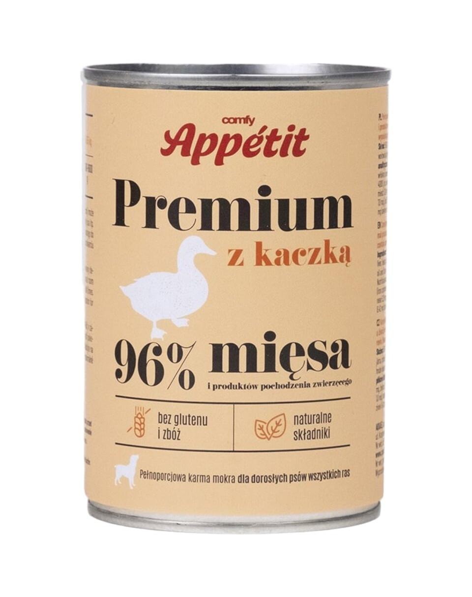 Comfy Appetit PREMIUM è un alimento umido completo per cani adulti a base di ingredienti naturali. Il vostro animale domestico amerà questa miscela di carne selezionata. L'alimento contiene il 96% di ingredienti di carne, pesce e origine animale ed è ricco di vitamine e minerali.