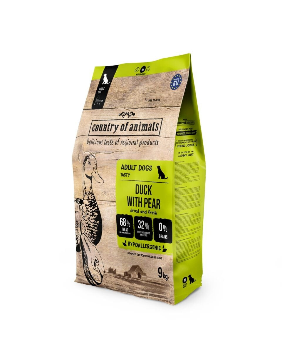 Anatra (52,5% – di cui 35% anatra secca, 17,5% anatra fresca), grasso di pollo (11%), piselli, piselli decorticati, fiocchi di patate essiccati, fegato di pollo idrolizzato (4%), lievito di birra essiccato (1%), semi di lino, polpa di barbabietola essiccata (senza zucchero), lignocellulosa (da abete), proteine di patate, minerali, pere essiccate (0,5%), olio di salmone (0,5%), cicoria essiccata, MOS (mannooligosaccaridi), glucosamina, solfato di condroitina, estratti vegetali (rosmarino, agrumi, curcuma, eugenia, yucca Mojave).