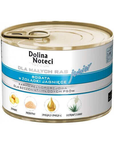 Alimento umido per cuccioli e giovani cani di piccola taglia, ricco di stomaco di agnello.