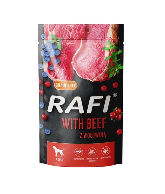 I prodotti a base di carne e manzo sono una fonte di proteine animali necessarie per il buon sviluppo del cane. Alla ricetta sono stati aggiunti mirtilli e mirtilli rossi, ricchi di vitamina C e con proprietà antiossidanti e diuretiche.
