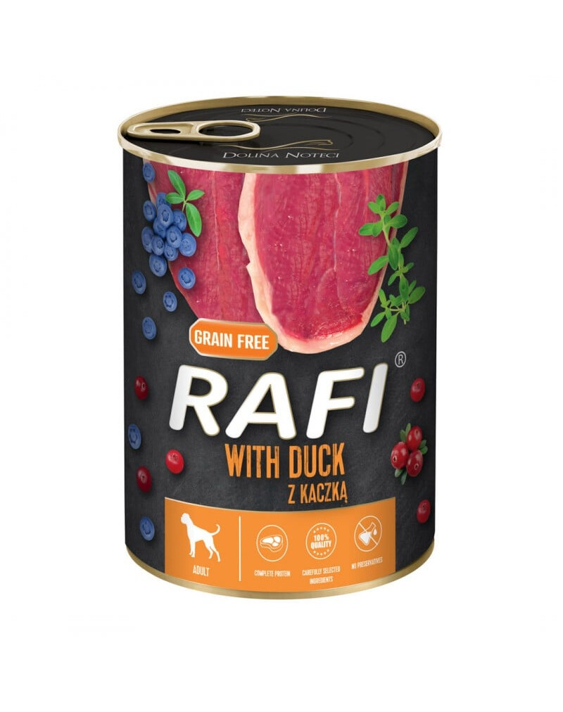 carne e prodotti di origine animale 65% (carne di anatra 4%), frutta (mirtillo 2%, mirtillo rosso 2%), minerali, oli e grassi (olio di lino 0,2%), timo secco 0,01%.