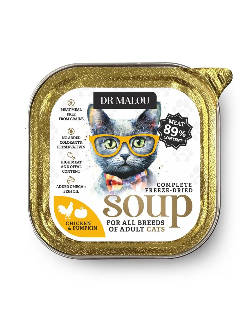 Stai cercando un pasto sano e naturale per il tuo gatto? Scopri la Zuppa liofilizzata DR MALOU con pollo e zucca – un cibo umido completo creato pensando ai bisogni naturali del tuo amico a quattro zampe!