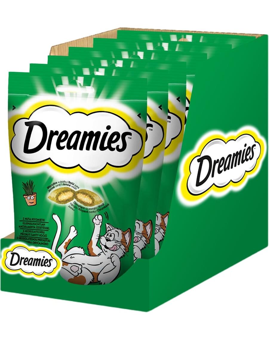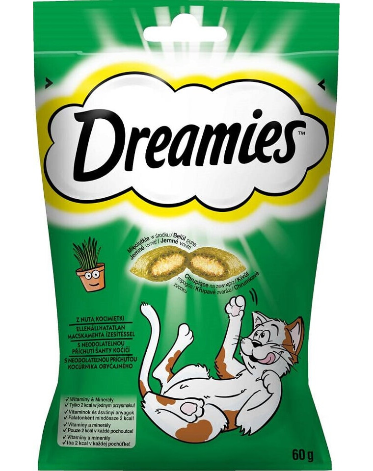 Dreamies con un pizzico di erba gatta sono deliziosi croccantini con un morbido ripieno per gatti di età superiore alle 8 settimane. La loro composizione è stata sviluppata da nutrizionisti e veterinari del WALTHAM Institute of Animal Science, in modo che i croccantini Dreamies non solo abbiano un ottimo sapore, ma siano anche arricchiti di minerali e vitamine. I croccantini Dreamies sono lo spuntino perfetto per sorprendere piacevolmente il vostro amico felino. Scuotete la confezione e vedrete il vostro gatto correre!