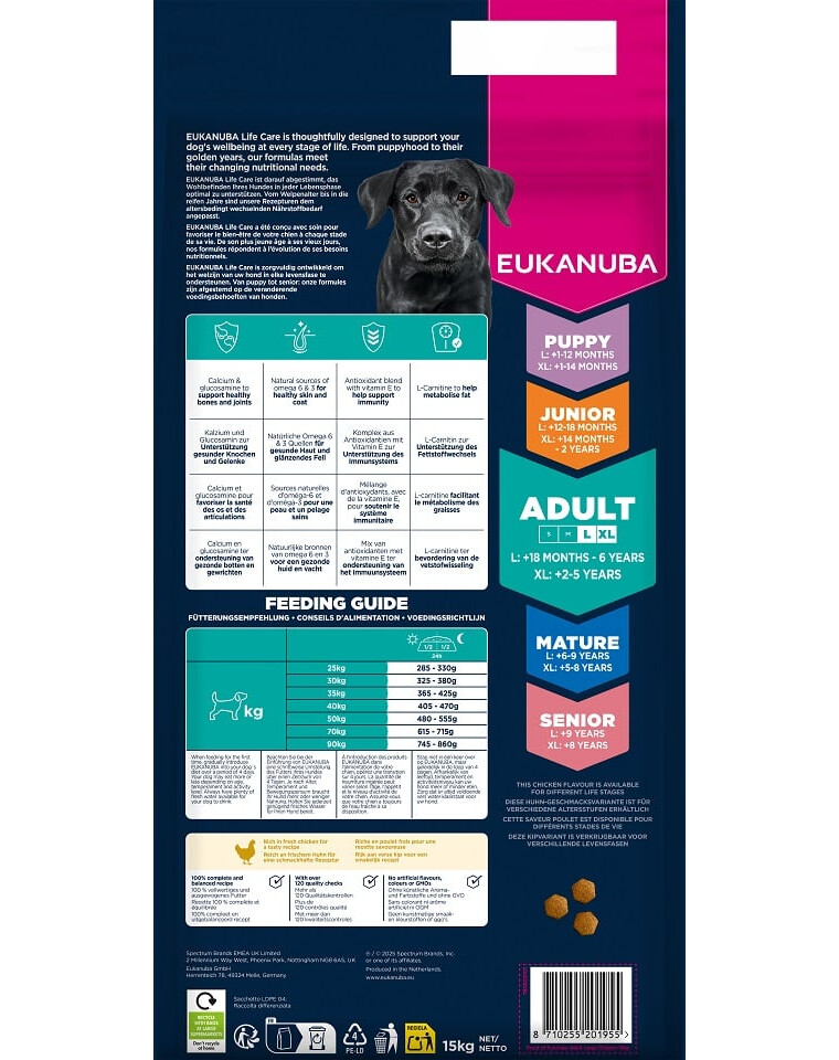 EUKANUBA Life Care è una linea di alimenti premium, sviluppata sulla base di ricerche scientifiche, per supportare le esigenze dei cani in ogni fase della vita. La variante Adult Large Breeds Chicken è stata formulata per cani adulti di razze grandi di età compresa tra 18 mesi e 6 anni e per cani di razze giganti di età compresa tra 2 e 5 anni.