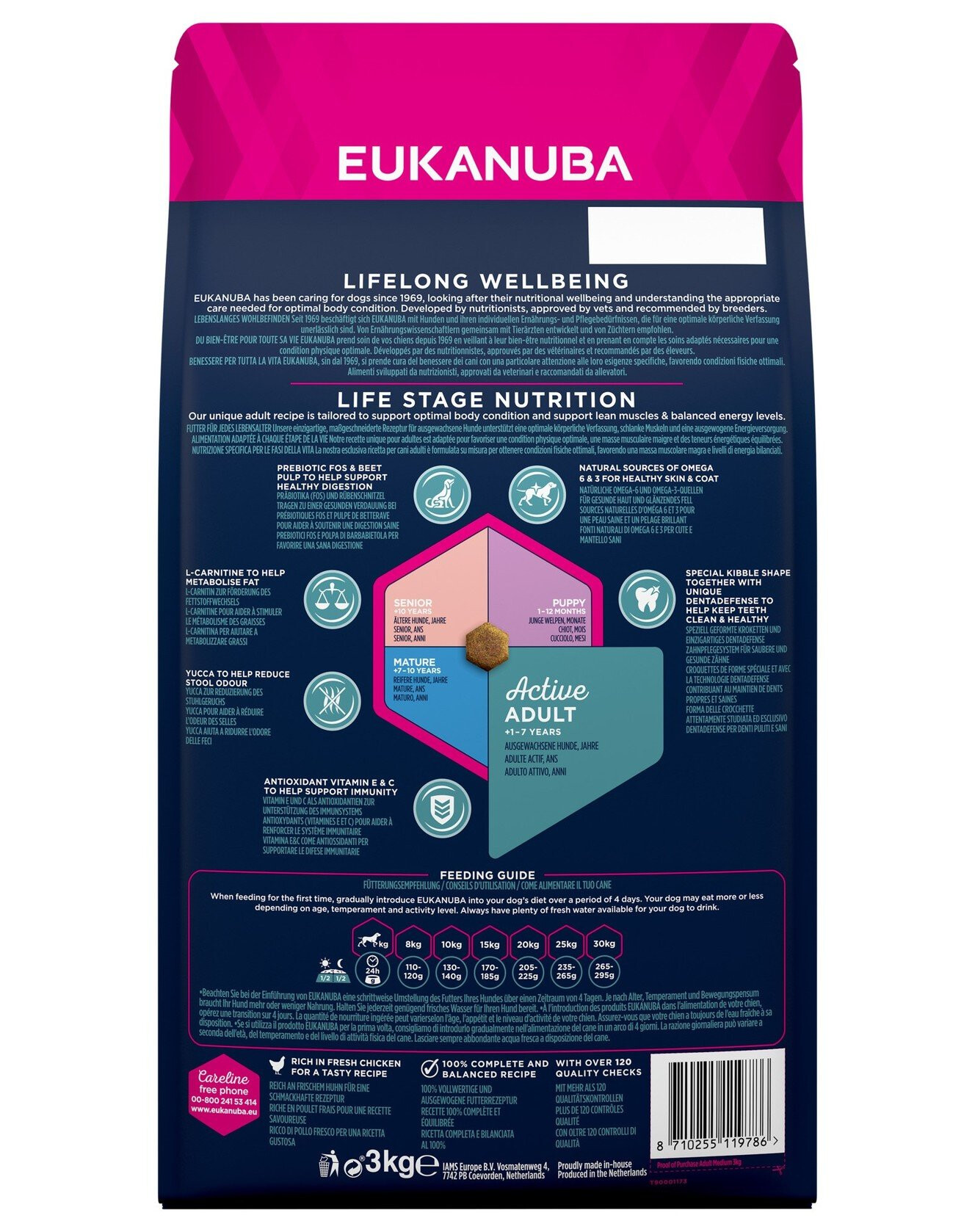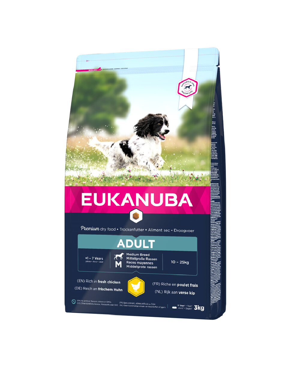 EUKANUBA Active Adult Medium Breed è un alimento per cani di razza media con pollo fresco.