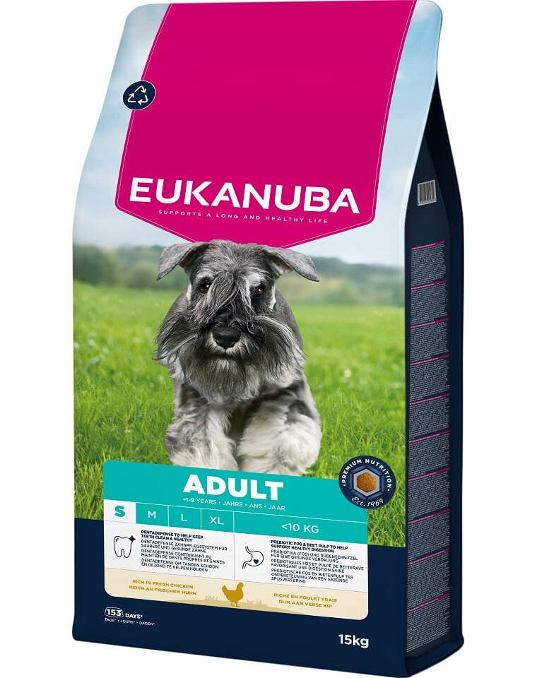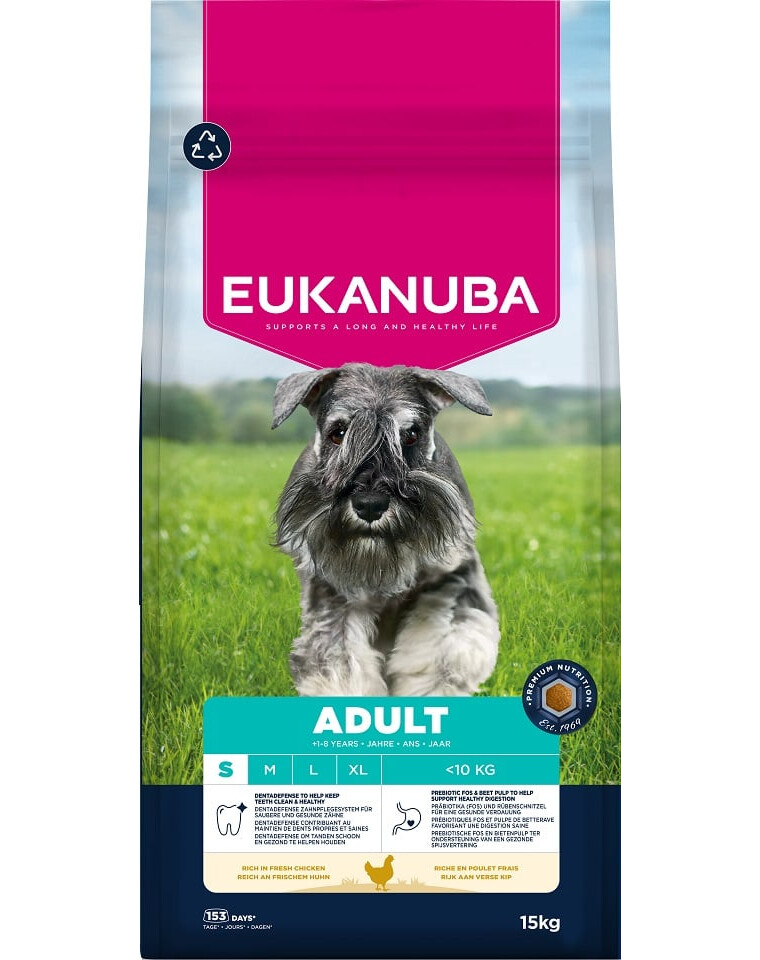 Cibo secco EUKANUBA per cani adulti, ricco di pollo fresco, è 100% completo e bilanciato ed è ideale per le razze piccole di età compresa tra 1 e 8 anni.