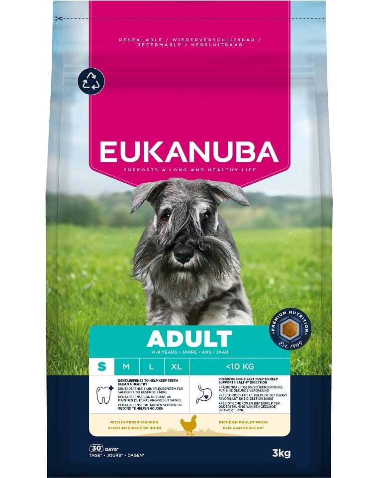 Cibo secco EUKANUBA per cani adulti, ricco di pollo fresco, è 100% completo e bilanciato ed è ideale per cani di piccola taglia di età compresa tra 1 e 8 anni.