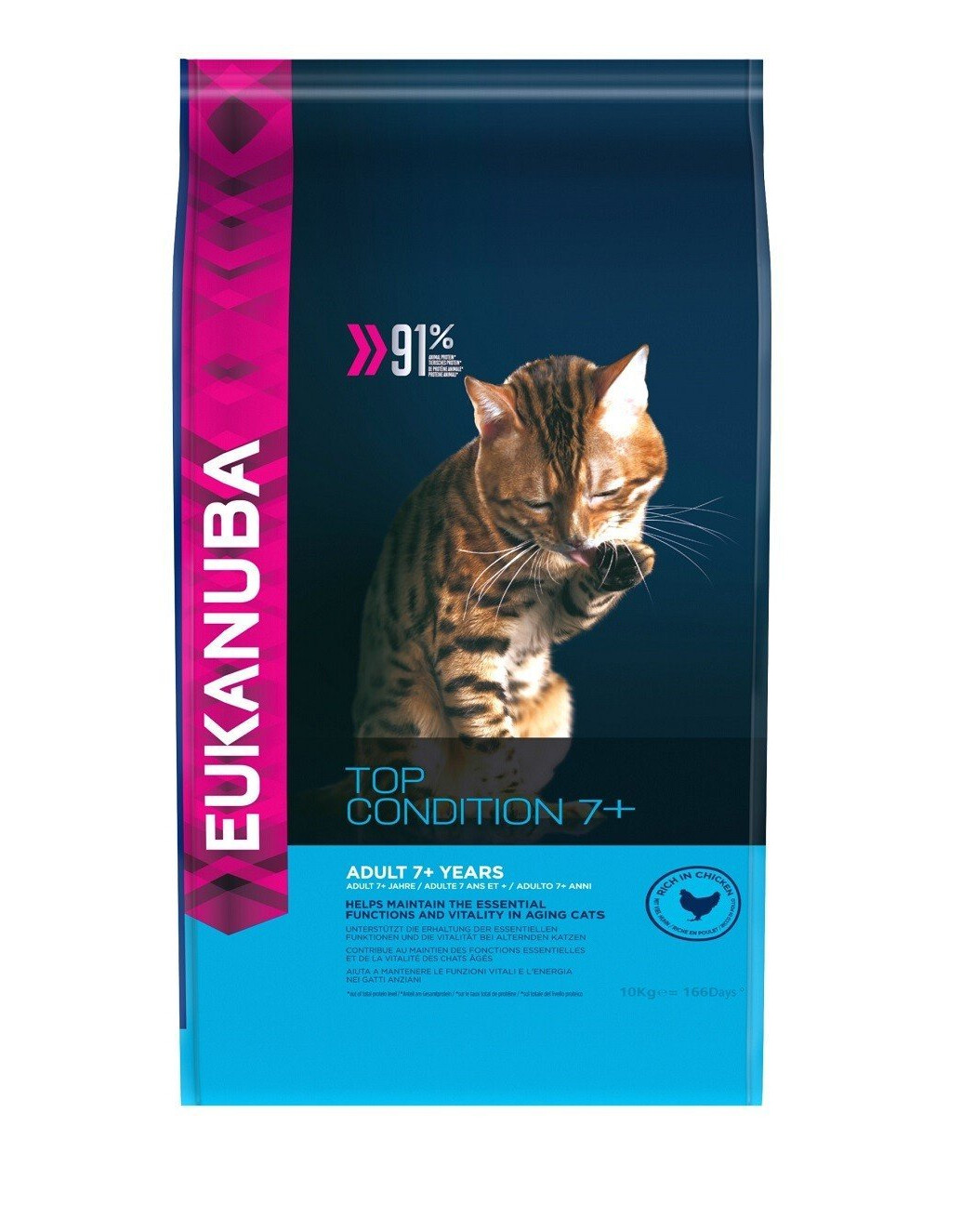 Le crocchette Eukanuba per gatti anziani sono un alimento completo e bilanciato al 100%. La loro gustosa ricetta è ricca di pollo fresco e contiene l'89% di proteine animali (del contenuto proteico totale), utili per sviluppare e mantenere una muscolatura forte.
