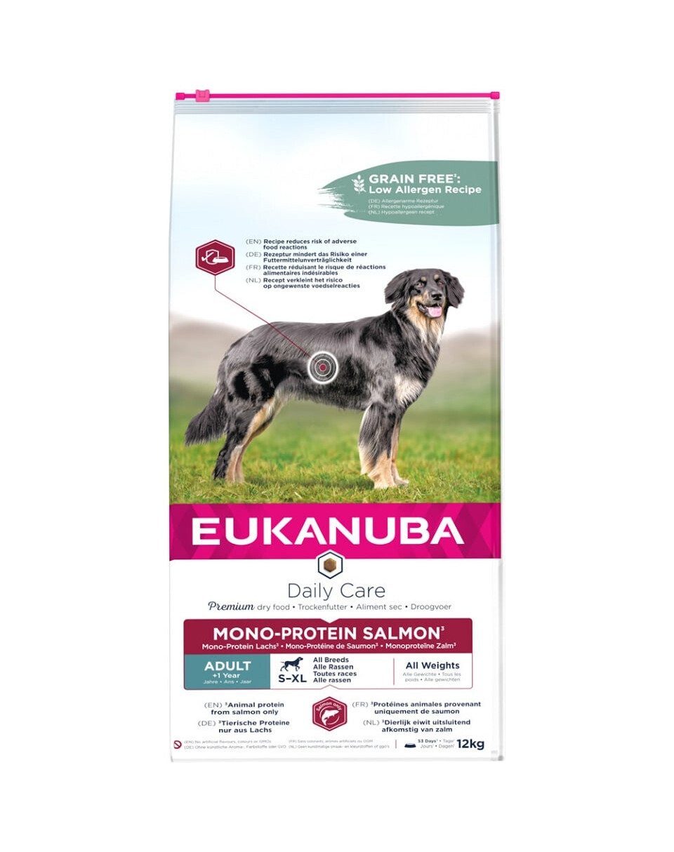 EUKANUBA Daily Care - cibo secco monoproteico al salmone* per cani adulti contiene un'unica fonte di proteine animali. Tutti gli ingredienti di origine animale contenuti in questo alimento sono esclusivamente salmone per ridurre il rischio di reazioni alimentari avverse. e per contribuire al mantenimento di una muscolatura non grassa. Questa gustosa ricetta contiene i prebiotici FOS, MOS e la polpa di barbabietola per favorire una corretta digestione.