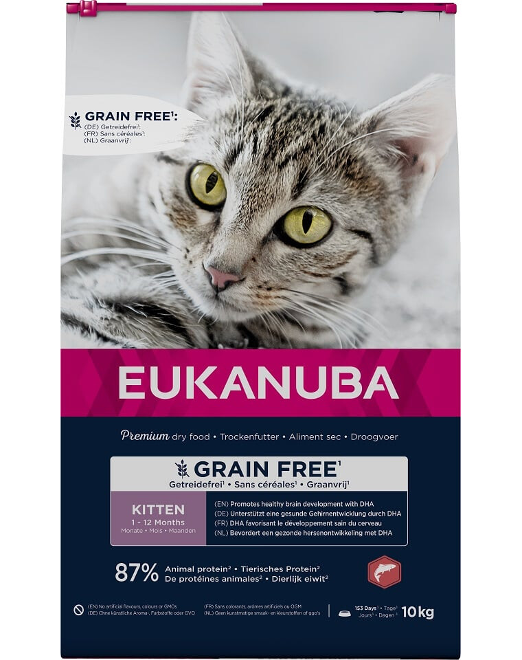 Il nostro cibo secco EUKANUBA Grain Free per gattini in crescita rappresenta un'alternativa per i gatti con esigenze dietetiche particolari. L'elevato livello di proteine animali, pari all'87% del contenuto proteico totale, favorisce lo sviluppo e il mantenimento della muscolatura non grassa, mentre gli acidi DHA contenuti stimolano il normale sviluppo cerebrale. Gli antiossidanti favoriscono la naturale immunità e vitalità. La formula ricca di salmone fornisce acidi grassi Omega-3 da fonti naturali. Per favorire la salute del cuore, abbiamo aggiunto alla formulazione una dose extra di taurina. L'alimento contiene molti prebiotici e fibre per favorire la salute dell'intestino e la digestione. Le nostre fonti alternative di carboidrati, patate e piselli, forniscono una fonte naturale di fibre e minerali. Inoltre, il lievito presente nel mangime funge da fonte naturale di vitamine e aminoacidi essenziali. Tutti questi ingredienti sono essenziali durante la fase di crescita del gattino e contribuiscono attivamente a un inizio di vita sano.