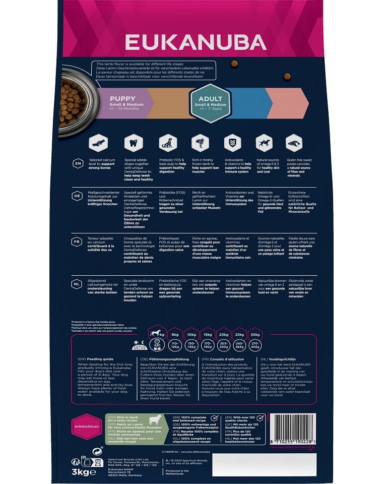 Il cibo secco EUKANUBA Grain Free ricco di agnello fresco congelato per razze adulte di piccola e media taglia favorisce il mantenimento della muscolatura non grassa. La formulazione include antiossidanti e vitamine per il corretto funzionamento del sistema immunitario e patate dolci senza glutine come fonte naturale di fibre e minerali. Per favorire una corretta digestione, sono stati aggiunti polpa di barbabietola e prebiotici FOS, oltre a una quantità di calcio sufficiente a sostenere la salute delle ossa. Inoltre, il contenuto di fonti naturali di acidi grassi Omega-6 e Omega-3 ha un effetto positivo sulla salute della pelle e sulla lucentezza del pelo. La speciale forma dei pellet e l'esclusivo sistema DentaDefense contribuiscono a mantenere i denti sani e puliti. L'alimento EUKANUBA Grain Free per cani adulti di piccola e media taglia è completo e bilanciato al 100%, per garantire il benessere del cane.