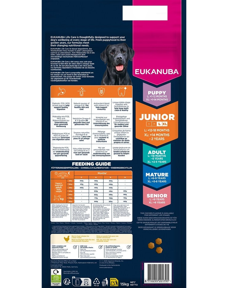 EUKANUBA Life Care è una linea di cibo premium sviluppata sulla base di ricerche scientifiche, per rispondere completamente alle esigenze in evoluzione del corpo del cane in ogni fase della sua vita. Questa formula è stata creata specificamente per cuccioli di grandi razze di età compresa tra 12 e 18 mesi (o 14 mesi–2 anni nel caso delle razze giganti), un periodo in cui lo sviluppo dello scheletro e dei muscoli è ancora in corso, mentre il cane inizia lentamente a entrare nell'età adulta.