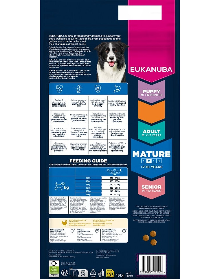 EUKANUBA Life Care è una linea di cibi premium, sviluppata sulla base di ricerche scientifiche, che supporta la salute del cane in ogni fase della vita. Questo cibo è stato creato per cani adulti di razza media di età compresa tra 7 e 10 anni, fornendo proteine preziose dal pollo fresco e nutrienti completi che supportano la vitalità e un invecchiamento sano.