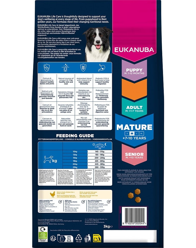 EUKANUBA Life Care è una linea di alimenti premium sviluppata sulla base di ricerche scientifiche per fornire ai cani nutrienti preziosi adattati alle loro esigenze in evoluzione in ogni fase della vita. Questa formula è stata creata specificamente per cani adulti di razze medie di età compresa tra 7 e 10 anni, che richiedono una dieta che supporti un invecchiamento sano, vitalità e il mantenimento di una condizione ottimale.