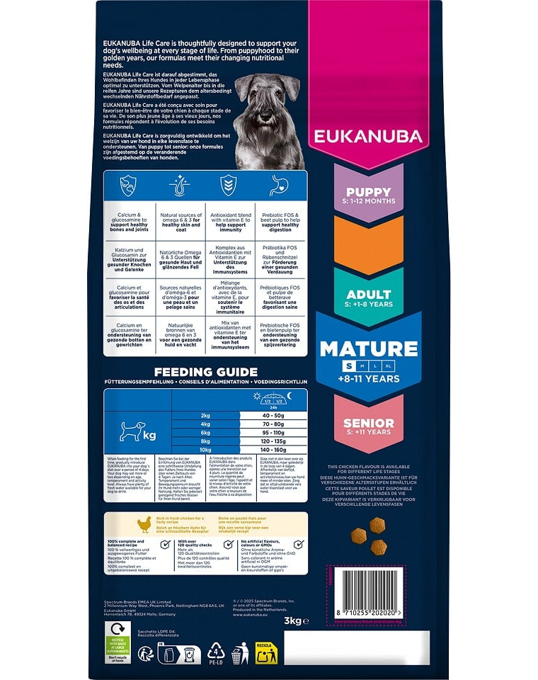 EUKANUBA per cani adulti, ricca di pollo fresco, è un cibo secco 100% completo e bilanciato ed è ideale per le piccole razze di età compresa tra 8 e 11 anni, fornendo proteine di alta qualità che supportano la forza muscolare e la corretta condizione del corpo.