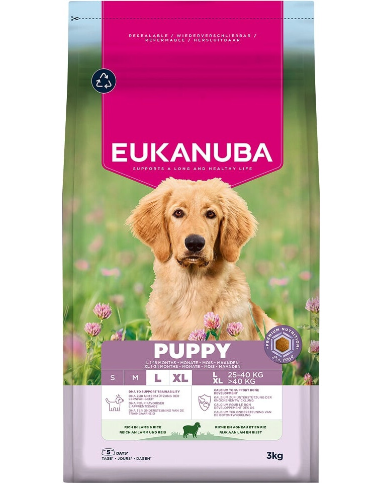 Questo cibo secco EUKANUBA per cuccioli, ricco di agnello e riso, è 100% completo e bilanciato ed è ideale per razze grandi di età compresa tra 1 e 18 mesi (fino a 24 mesi per le razze giganti).