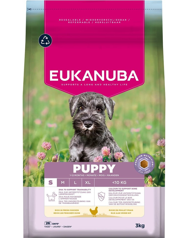 Questo cibo secco per cuccioli EUKANUBA, ricco di pollo fresco, è 100% completo e bilanciato ed è ideale per le piccole razze di età compresa tra 1 e 12 mesi.