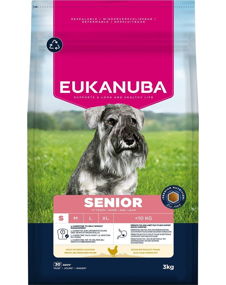 Questo cibo secco EUKANUBA per cani anziani, ricco di pollo fresco, è 100% completo e bilanciato ed è ideale per le razze piccole di età superiore agli 11 anni.