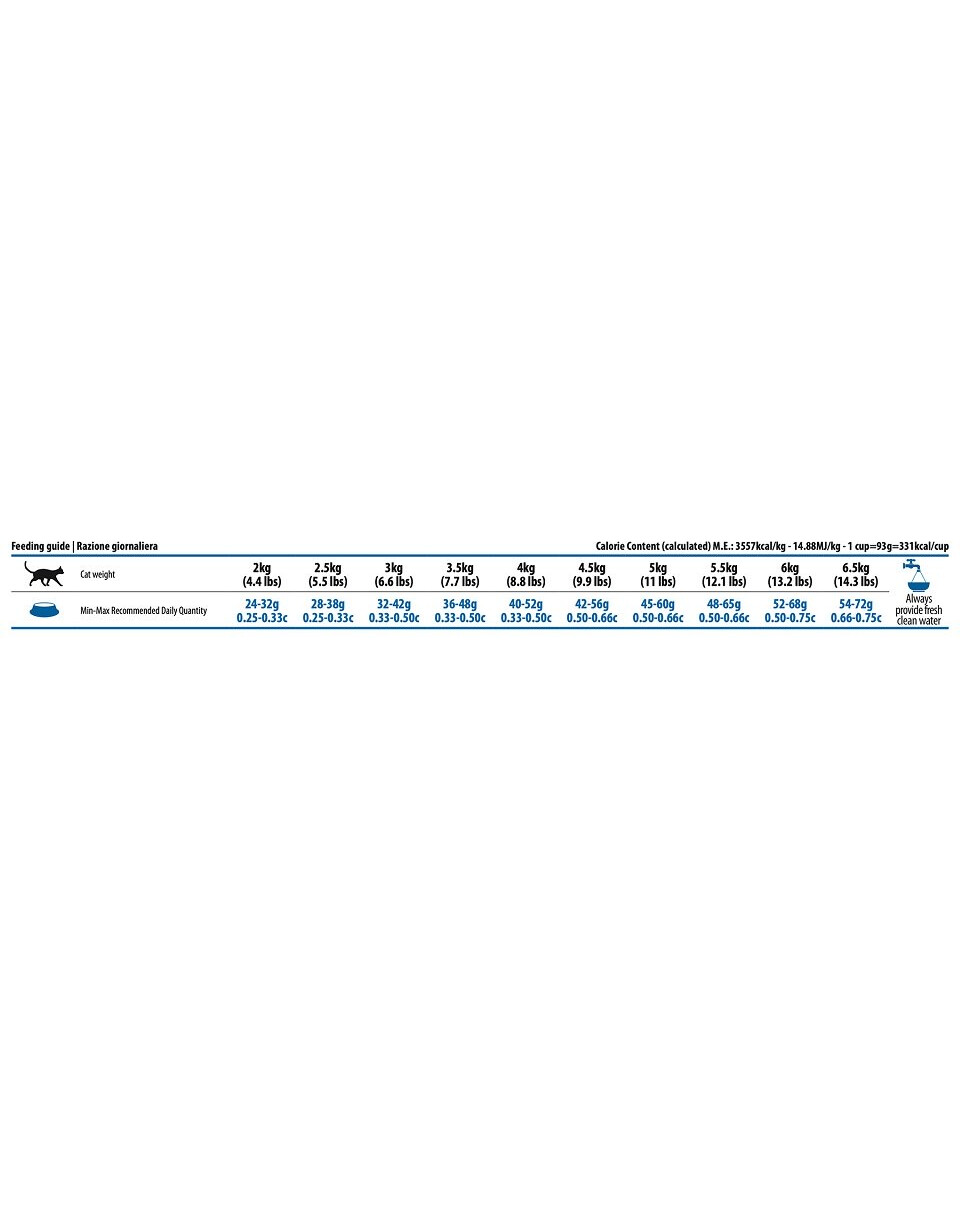 Proteina grezza 38,00%; grassi grezzi 10,00%; fibra grezza 5,50%; umidità 8,00%; ceneri grezze 8,30%; calcio 1,10%; fosforo 0,90%; magnesio 0,08%; acidi grassi Omega-6 1,80%; acidi grassi Omega-3 0,55%; DHA 0,25%; EPA 0,15%; glucosamina 1200mg/kg; condroitinsolfato 900mg/kg.