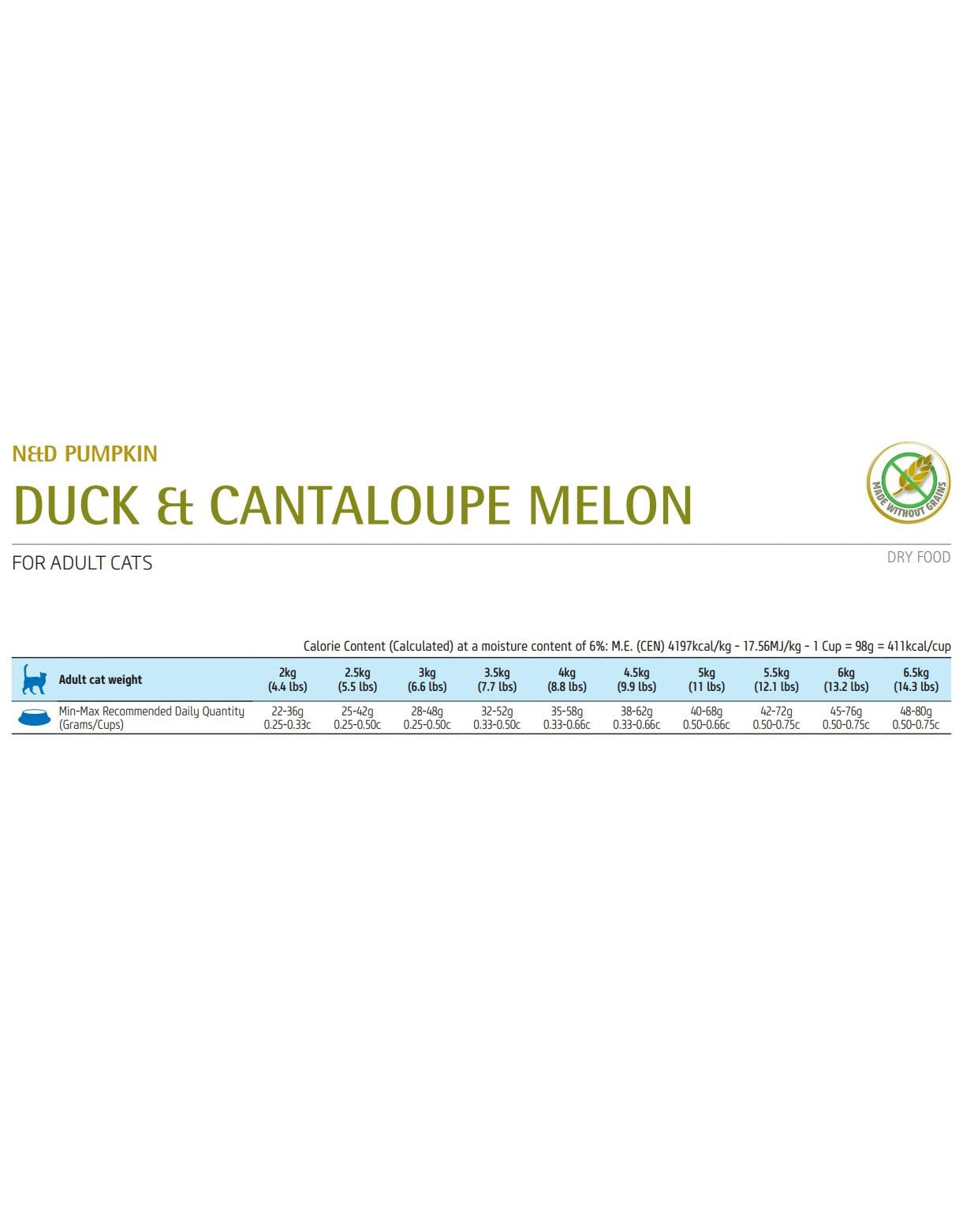 Carne d'anatra fresca (30%), carne d'anatra essiccata (28%), amido di piselli, grasso di pollo, zucca essiccata (5%), uovo intero essiccato, carne d'aringa fresca, carne d'aringa essiccata, olio di pesce (da aringa), carote essiccate, erba medica essiccata, inulina, frutto-oligosaccaridi, estratto di lievito (fonte di mannanoligosaccaridi), melone di cantalupo essiccato (0,5%), melograno essiccato, mela essiccata, spinaci essiccati.5%), melograno essiccato, mela essiccata, spinaci essiccati, psillio (0,3%), arancia dolce essiccata, mirtilli essiccati, cloruro di sodio, lievito di birra essiccato, curcuma (0,2%), glucosamina, condroitina solfato.