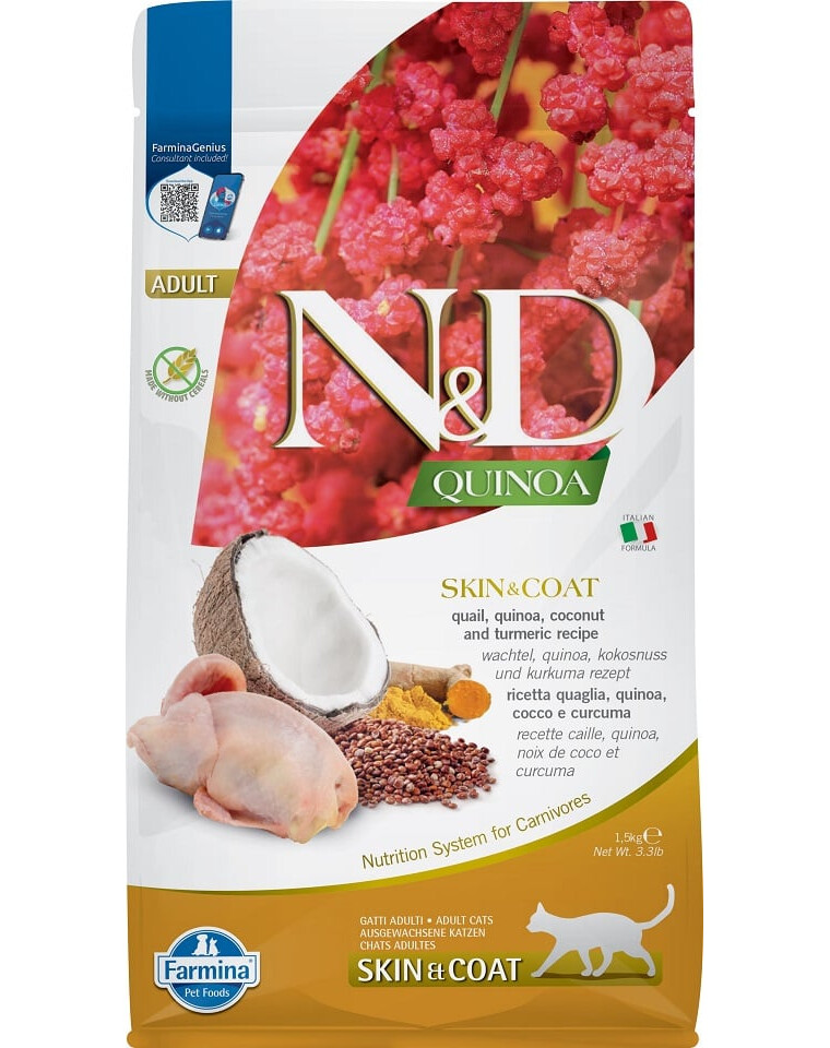 La ricetta si basa sulla carne di quaglia fresca ed essiccata, caratterizzata da tenerezza e basso potenziale allergenico. L'elevato contenuto di proteine animali complete contribuisce a mantenere il gatto in salute e in buone condizioni. Gli additivi principali dell'alimento sono il cocco e la quinoa. La noce di cocco è responsabile dello splendido aroma del cibo, ma soprattutto fornisce zinco, rame, ferro, potassio, magnesio, fosforo e sodio facilmente digeribili. Gli acidi laurico e caprilico in esso contenuti hanno effetti antinfiammatori, antibatterici e lenitivi sulle malattie della pelle. Il cocco facilita l'assorbimento degli acidi grassi insaturi. La quinoa è priva di glutine ed è considerata un alimento estremamente nutriente. Favorisce l'assorbimento dei nutrienti, è una fonte di aminoacidi essenziali, antiossidanti, ha un basso indice glicemico e ha un effetto positivo sul sistema cardiovascolare. Il mangime è stato arricchito con la radice di curcuma, che ha un ampio effetto benefico sulla salute ed è raccomandata per la prevenzione del cancro.