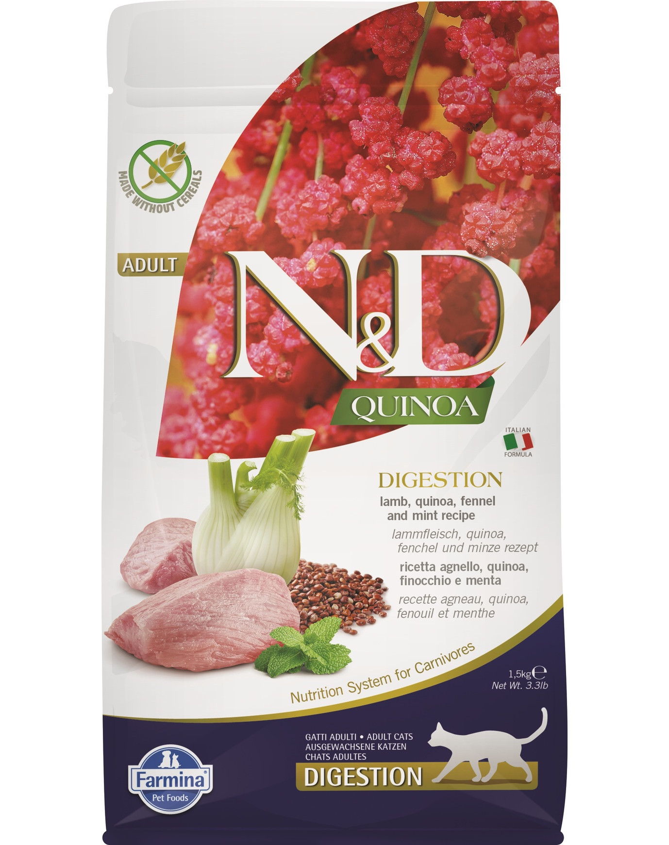 La ricetta si basa su carne di agnello fresca ed essiccata, caratterizzata da tenerezza e basso potenziale allergenico. L'elevato contenuto di proteine animali sane contribuisce a mantenere il gatto in salute e in buone condizioni. Gli additivi principali dell'alimento sono la quinoa, il finocchio e la menta.