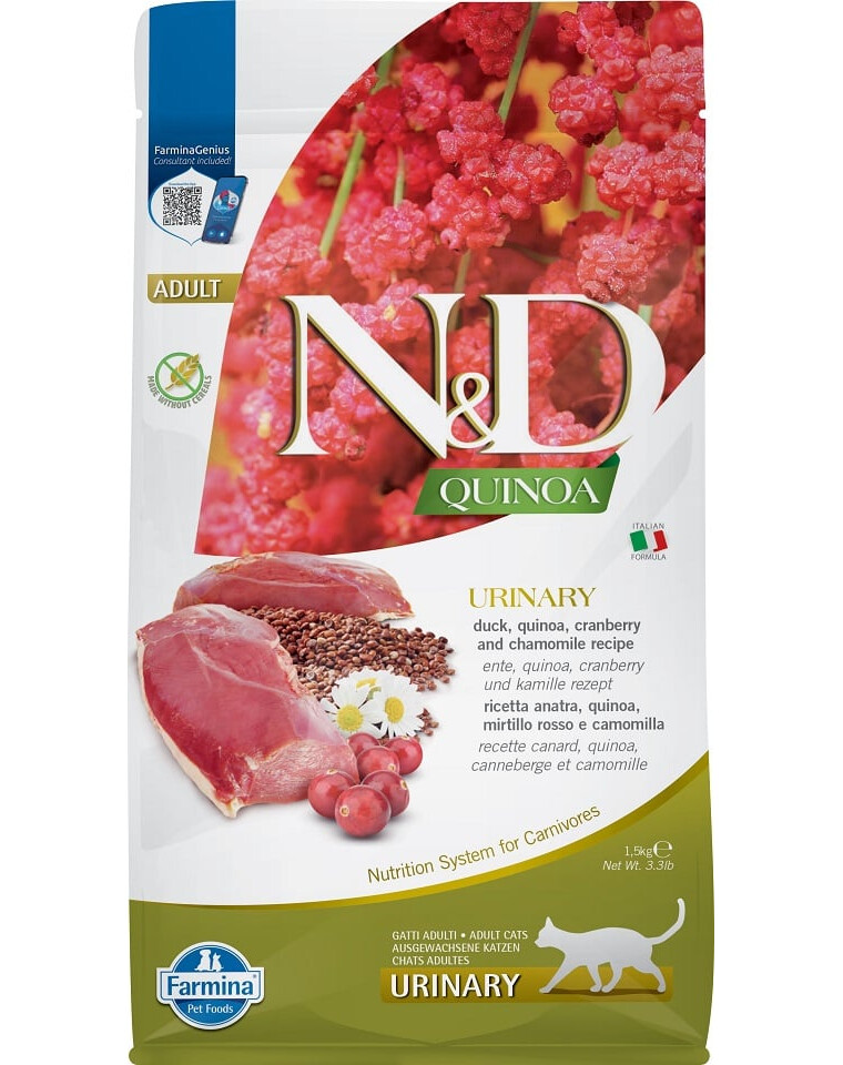 La quinoa è priva di glutine ed è riconosciuta come un alimento estremamente nutriente. Favorisce l'assorbimento dei nutrienti, è una fonte di aminoacidi essenziali, antiossidanti, ha un basso indice glicemico e ha un effetto positivo sul sistema cardiovascolare. La composizione dell'alimento è stata sviluppata per i gatti che soffrono di disturbi del tratto urinario. Gli ingredienti sono stati selezionati per favorire la normale funzione renale e per acidificare le urine. Il mirtillo rosso riduce l'adesione dei batteri all'epitelio vescicale grazie alla presenza di proantocianidine. Presenta proprietà che aiutano ad acidificare l'urina. La camomilla ha effetti antinfiammatori, batteriostatici, diuretici e diastolici. Se usato regolarmente, aiuta a ridurre la tensione e a calmare il gatto, il che è fondamentale nella vita di un gatto con FLUTD.