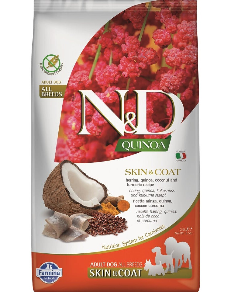 Farmina N&D Quinoa Skin & Coat è un alimento dietetico completo per cani consigliato per ridurre intolleranze a ingredienti e nutrienti