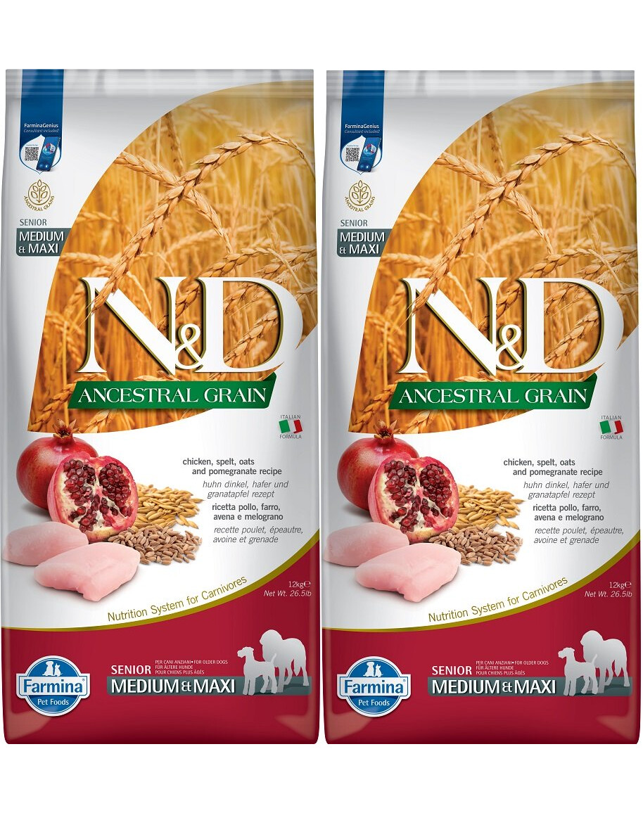 La ricetta contiene una piccola quantità di cereali - i cosiddetti prazbóż - avena e farro (10% ciascuno). I cani anziani hanno bisogno di una dieta speciale che rafforzi il loro organismo, permetta loro di godersi la vita e sia sufficientemente leggera per lo stomaco e il fegato. Inoltre, l'ingrediente principale dell'alimento è il pollo fresco ed essiccato, con l'aggiunta di carne di aringa. L'insieme di questi elementi garantisce un elevato livello di proteine animali, che favoriscono un'adeguata massa muscolare e una buona condizione corporea. La ricetta è completata da frutta, verdura ed erbe aromatiche. Il melograno è un frutto pregiato con molte proprietà benefiche per la salute. È considerato un frutto anti-cellule e ha proprietà di sostegno al cuore e al cervello. Gli spinaci forniscono ferro e le carote vitamina A. La grande quantità di erbe contenute nella miscela rafforza le difese immunitarie del cane.
