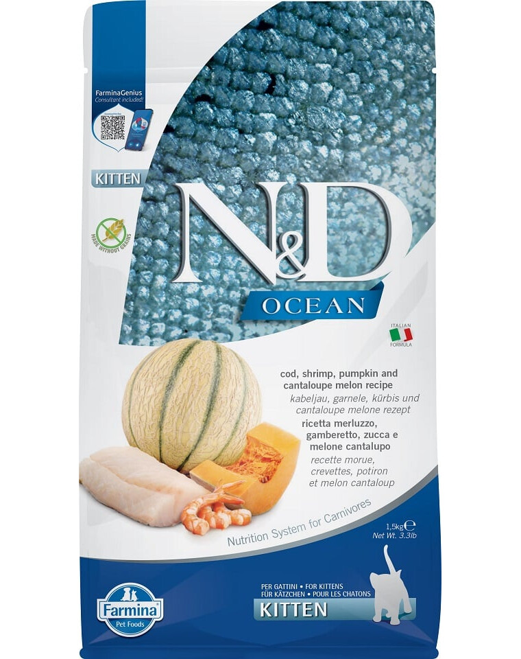 merluzzo (32%), proteina di merluzzo disidratata (30%), patata dolce, olio di pesce (da aringa), gamberetto disidratato (5%), zucca disidratata (5%), proteina di aringa disidratata, carote essiccate, farina di erba medica, inulina, fruttoligosaccaridi, estratto di lievito (fonte di manno-oligo-saccaridi), melone cantalupo essiccato (0.5%), melograno essiccato, spinaci essiccati, bucce e semi di psillio, mirtillo essiccato, mela essiccata, cloruro di sodio, cloruro di potassio, lievito di birra essiccato, curcuma (0.2%), estratto di Aloe vera.
