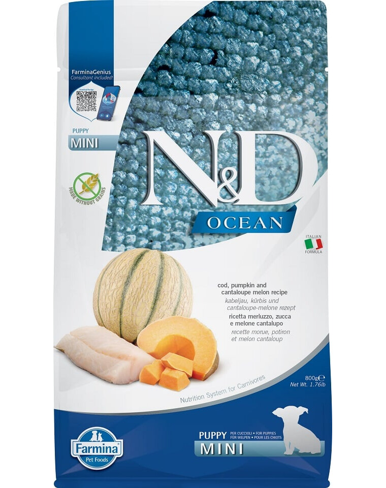 Merluzzo, zucca e melone cantalupo. Alimento completo per cuccioli e per cagne in gestazione o in allattamento.
