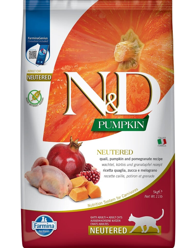 Ricetta a base di quaglia, zucca e melograno. Alimento completo per gatti adulti sterilizzati.