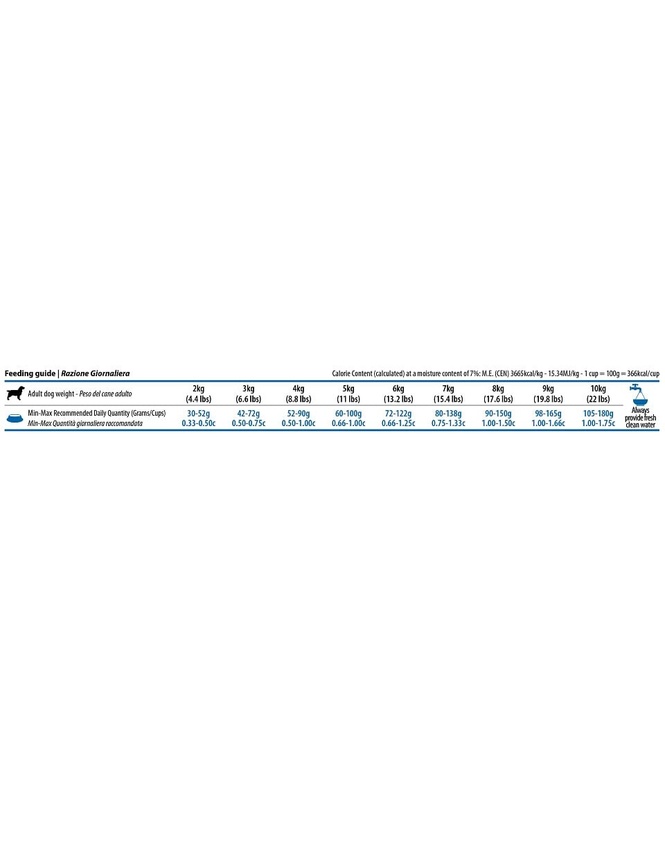 Proteina grezza 23,00%; Grassi grezzi 12,00%; Fibre grezze 2,80%; Umidità 9,00%; Ceneri grezze 7,90%; Calcio 1,00%; Fosforo 0,80%; Acidi grassi Omega-6 2,20%; Acidi grassi Omega-3 0,40%; DHA 0,20%; EPA 0,10%; Glucosamina 1200mg/kg; Solfato di condroitina 900mg/kg.